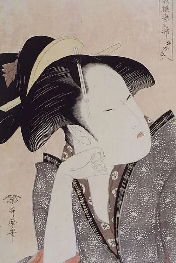 Œuvre de : Utamaro, Kitagawa Hauteur de l’original : 38,10 cm Largeur de l’original : 25,50 cm Période : époque Edo (1603-1868) Technique : estampe nishike-e Utamaro, Kitagawa – Amour pensif – estampe nishike-e © RMN-Grand Palais (musée Guimet, Paris)