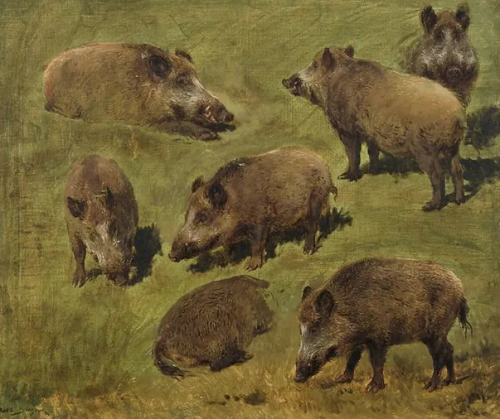 Œuvre de : Rosa Bonheur (dit), Bonheur Marie Rosalie Hauteur de l’original : 46,00 cm Largeur de l’original : 55,00 cm Technique : huile sur toile Rosa Bonheur (dit), Bonheur Marie Rosalie – Sangliers couchés et debout, 7 esquisses – huile sur toile © RMN-Grand Palais (Château de Fontainebleau)