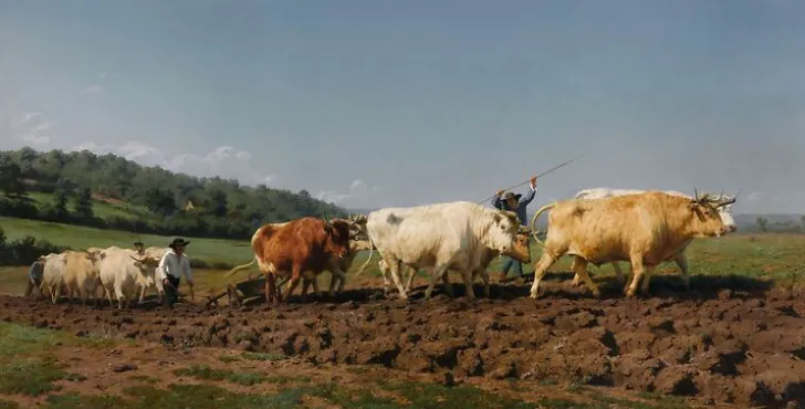 Œuvre de : Bonheur, Marie Rosalie Hauteur de l’original : 134,00 cm Largeur de l’original : 260,00 cm Période : période contemporaine de 1789 à 1914, 19e siècle Technique : huile sur toile Bonheur, Marie Rosalie – Labourage nivernais: le sombrage – huile sur toile © RMN-Grand Palais (musée d’Orsay)
