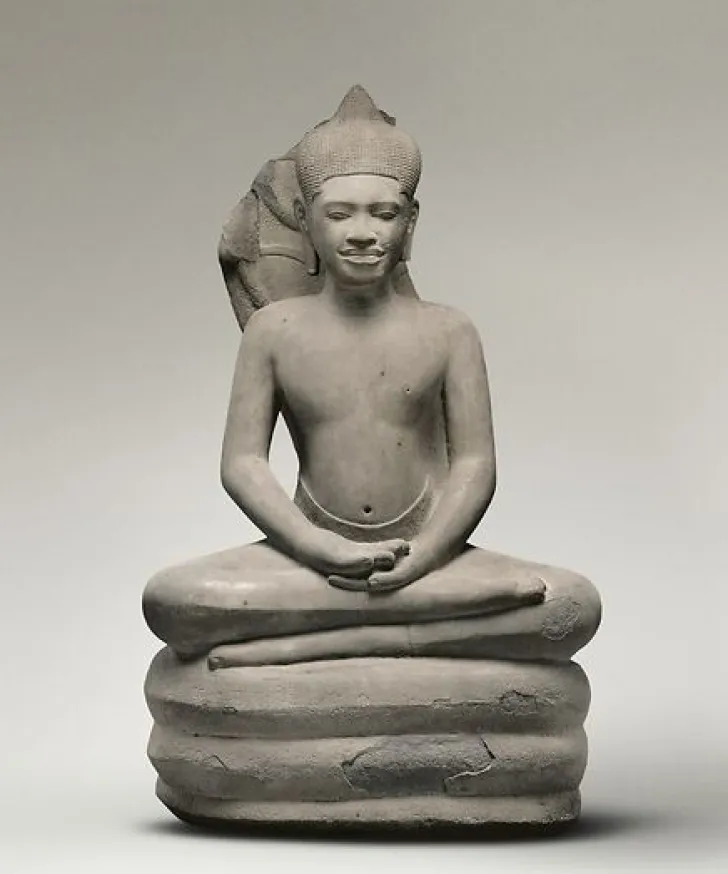 Œuvre de : Anonyme Bouddha en méditation sur le naga, XIe siècle, temple du Bayon, province de Siem Reap, Cambodge I Grès. H. 103 ; L. 62 ; P. 43 cm © Photo Rmn-Grand Palais (MNAAG, Paris) – T. Ollivier I © Rmn – Grand Palais, Paris 2019 – IC 20 1349