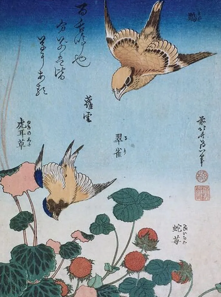 Œuvre de : Hokusai, Katsushika Hauteur de l’original : 24,50 cm Largeur de l’original : 18,00 cm Période : 19e siècle Technique : estampe nishike-e Hokusai, Katsushika – Hirondelle et pie sur fraisier et bégonia – estampe nishike-e © RMN-Grand Palais (musée Guimet, Paris)